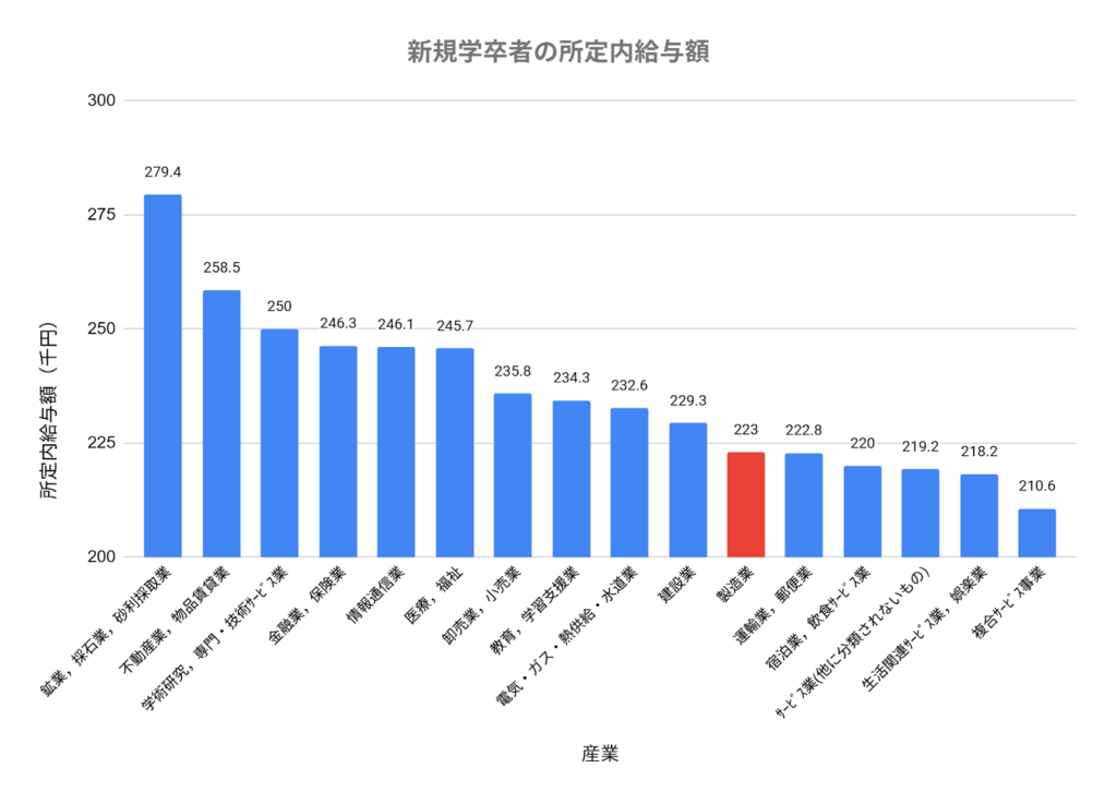 厚生労働省「令和6年 賃金構造基本統計調査」によると、製造業の初任給は16業種中11番目で、数字だけ見るとやや低めの水準といえます。